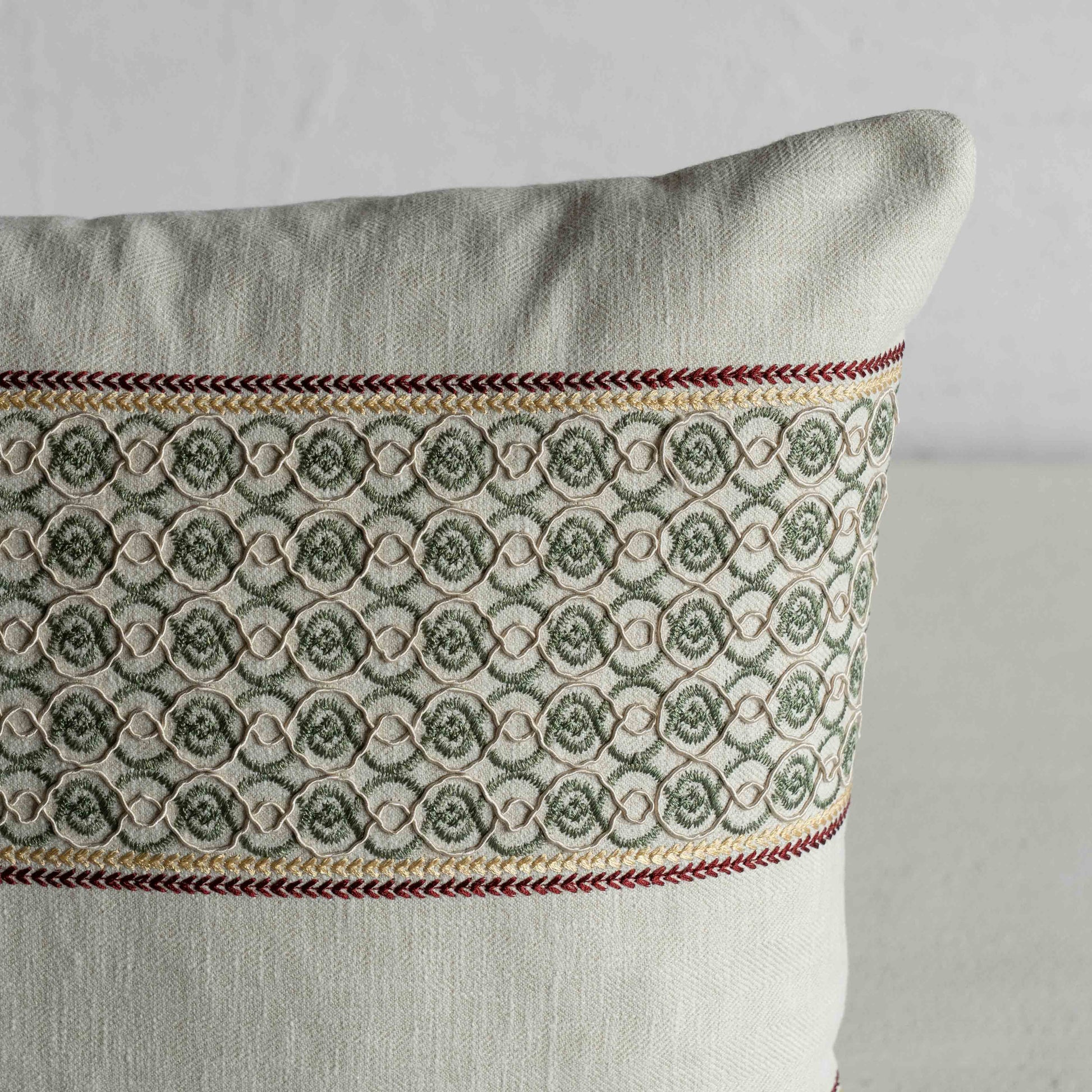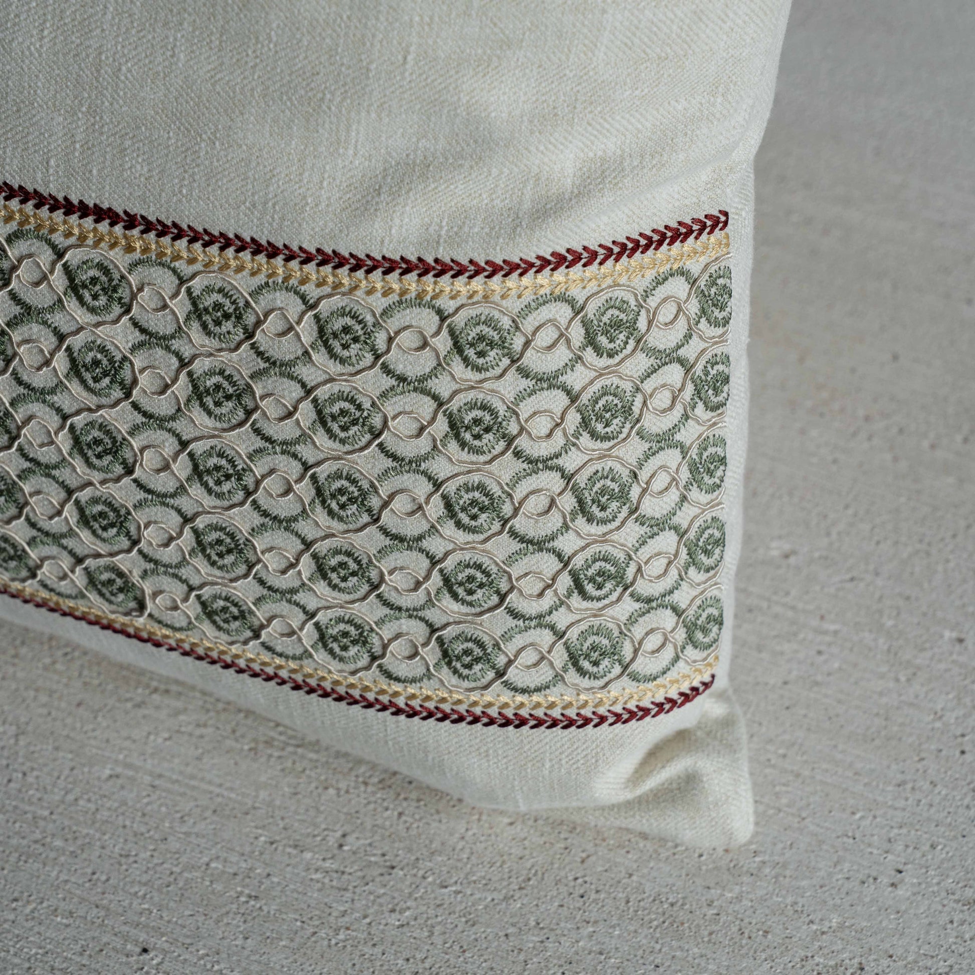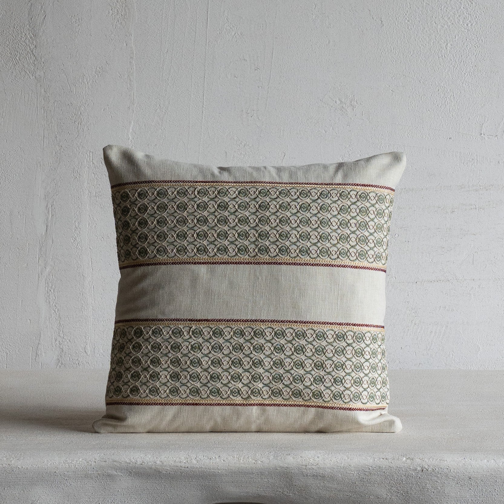 The Quiet Medinas Olive Green Cushion Cover is inspired by ancient city motifs and tiled walls, offering rich texture and artisan detail