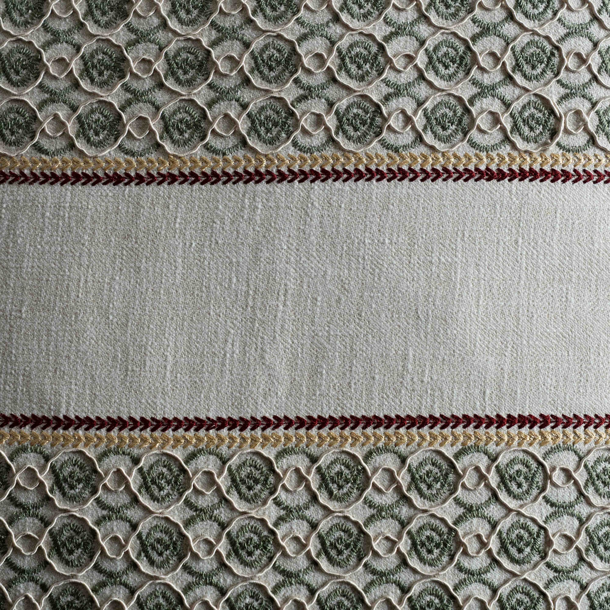 Earthy olive green fabric with geometric-inspired pattern